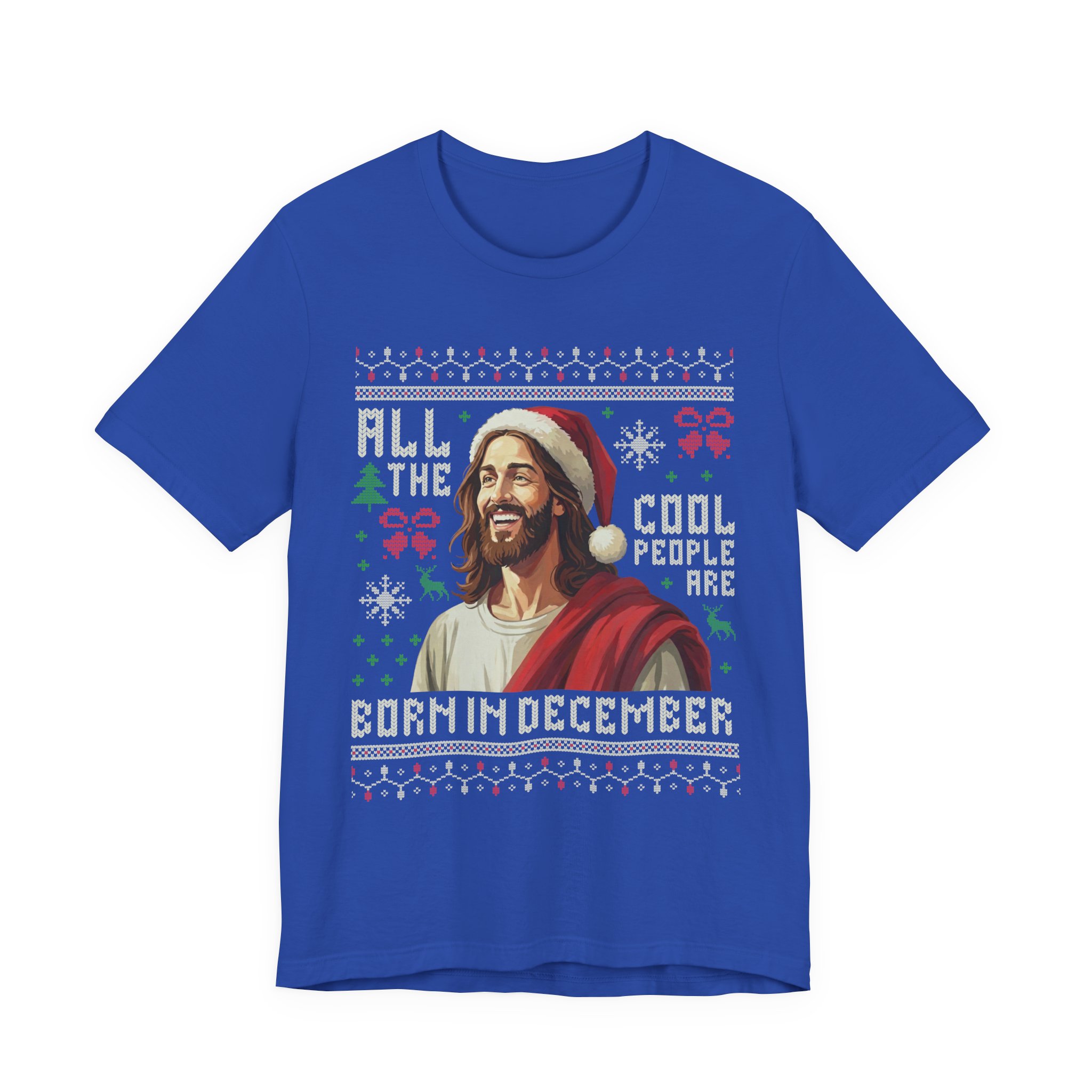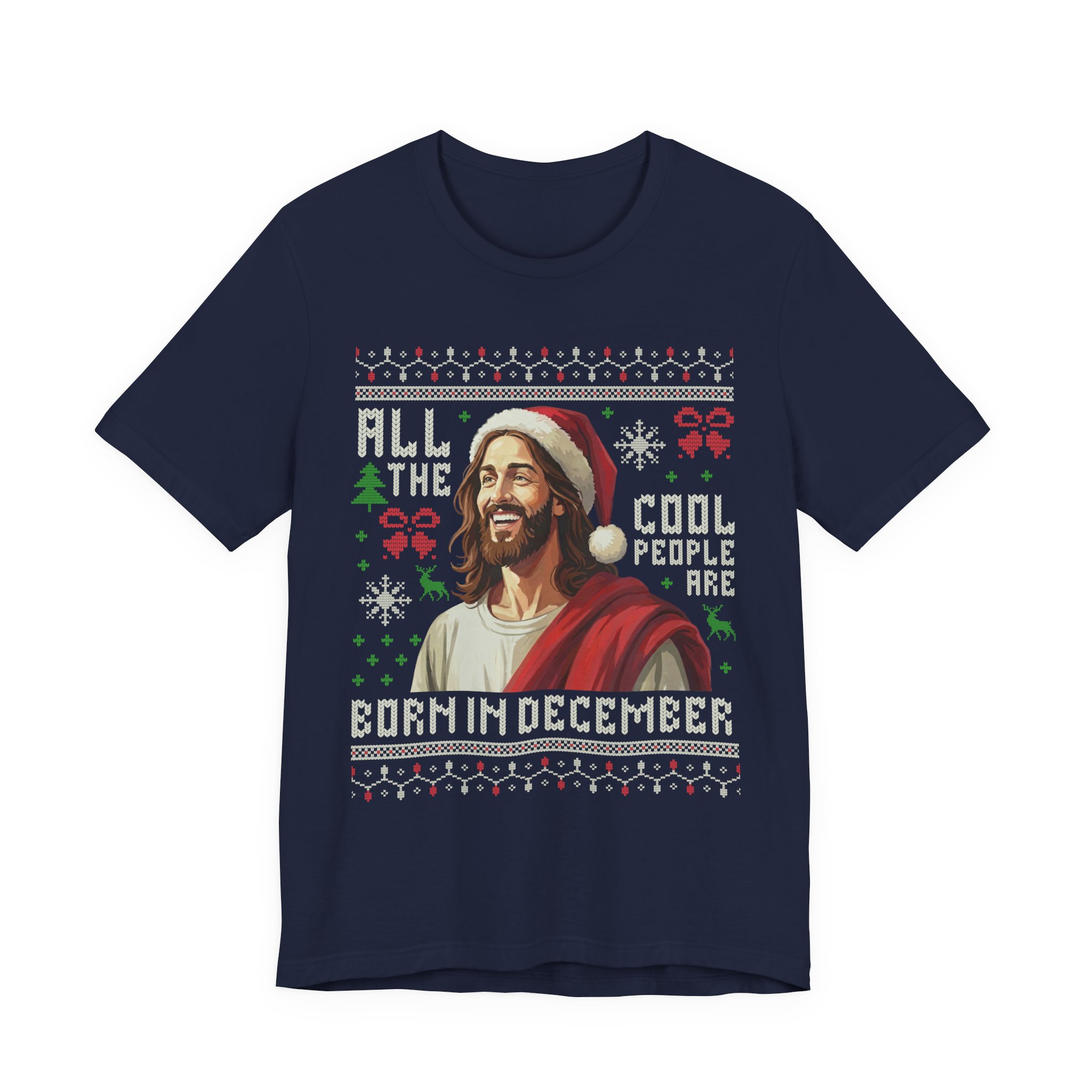 Celebrate your December birthday in style with this funny “All The Cool People Are Born In December” t-shirt. This festive design features a humorous illustration of Jesus wearing a Santa hat, rendered in a classic faux-knit “ugly Christmas sweater” pattern.